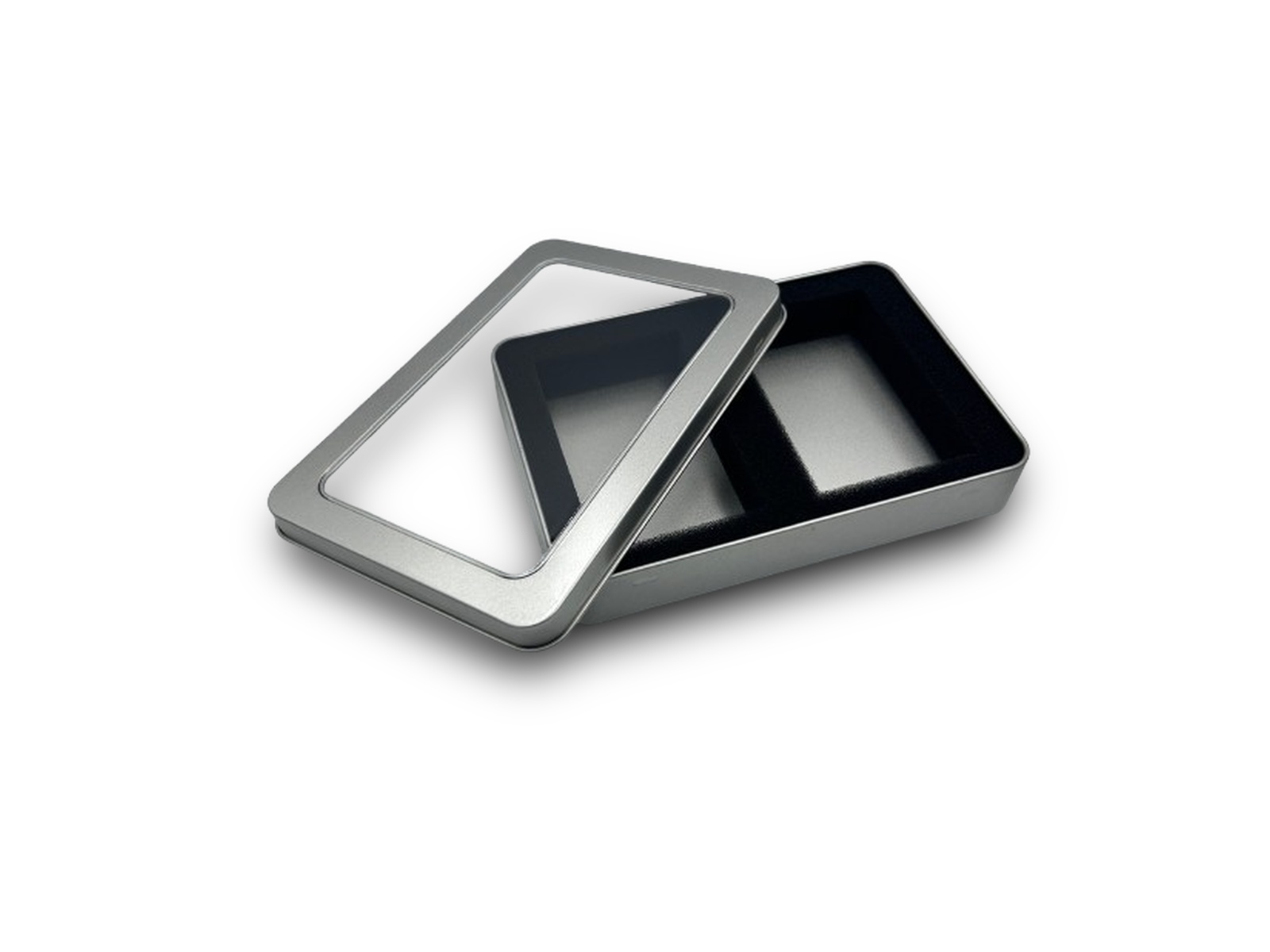 Blikken verpakkingsdoosje met venster geschikt voor 2 sets kaartspellen met kaartformaat 56×87 mm.