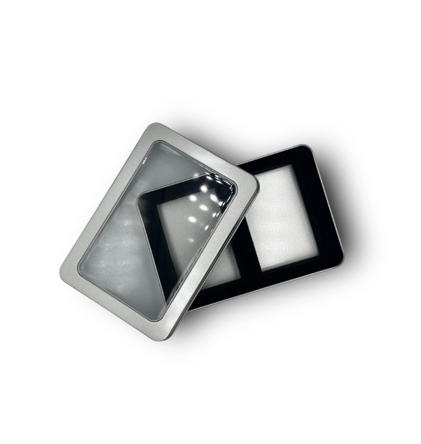 Blikken doosje bestaande uit een losse bodem en deksel. Het deksel is voorzien van een transparant venster zodat de inhoud goed zichtbaar is.