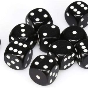 Brick met 12 stuks 16 mm. dobbelstenen. Kleurstelling zwart met witte stippen.